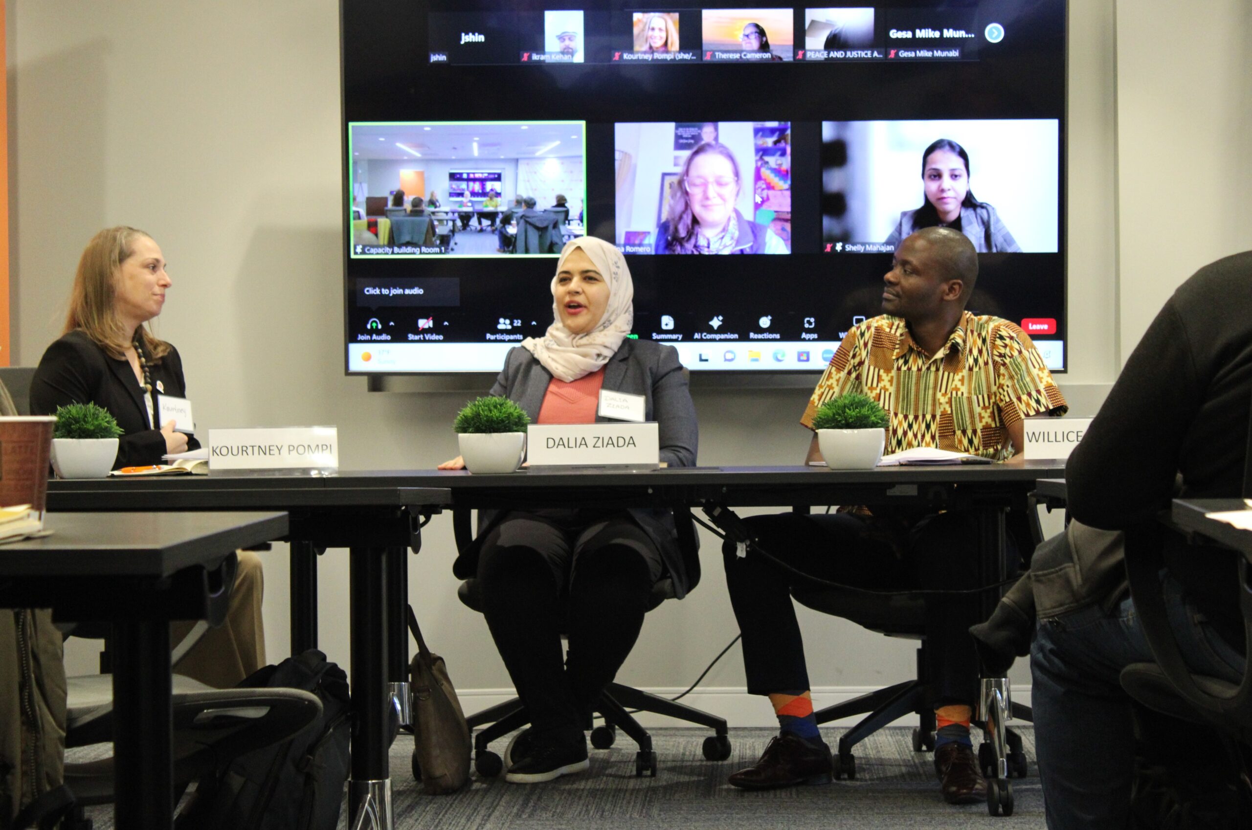 (Left to right) Kourtney Pompi, Counterpart’s acting senior director of governance, moderated the first panel highlighting regional perspectives alongside panelists Dalia Ziada of Liberal Democracy Institute, and Willice Onyango of The Youth Cafe, at Counterpart’s DC office.